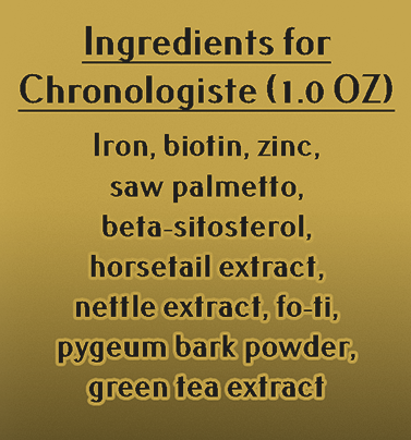 Iron, biotin, zinc, saw palmetto, beta-sitosterol, horsetail extract, nettle extract, fo-ti, pygeum bark powder, green tea extract