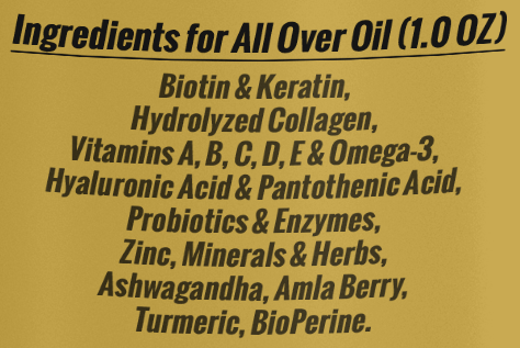 Vitamins A, B, C, D, E & Omega-3, Hyaluronic Acid & Pantothenic Acid, Probiotics & Enzymes, ZinG, Minerals & Hers, Ashwagandha, Amla Berry, Turmeric, BioPerine.
